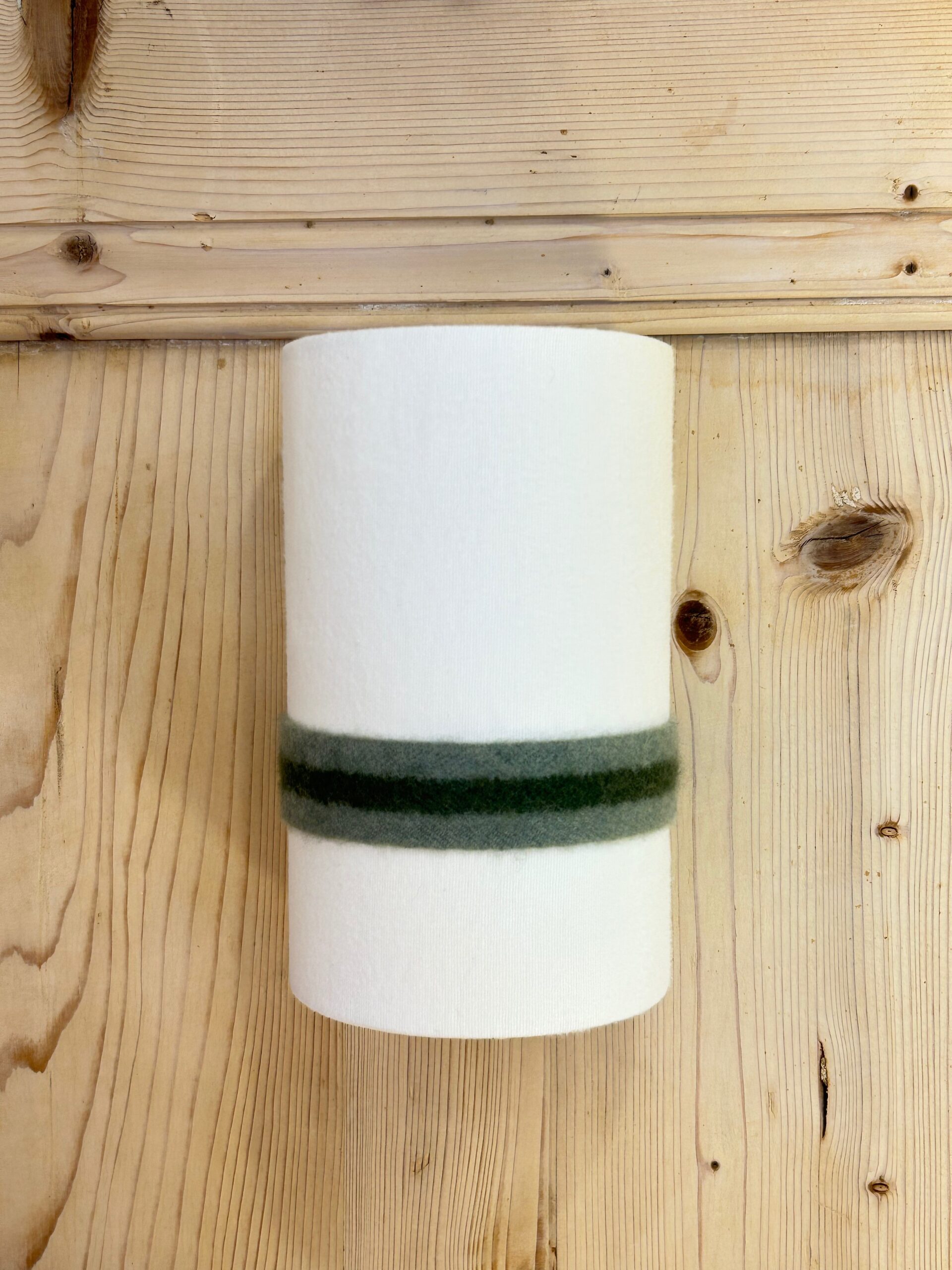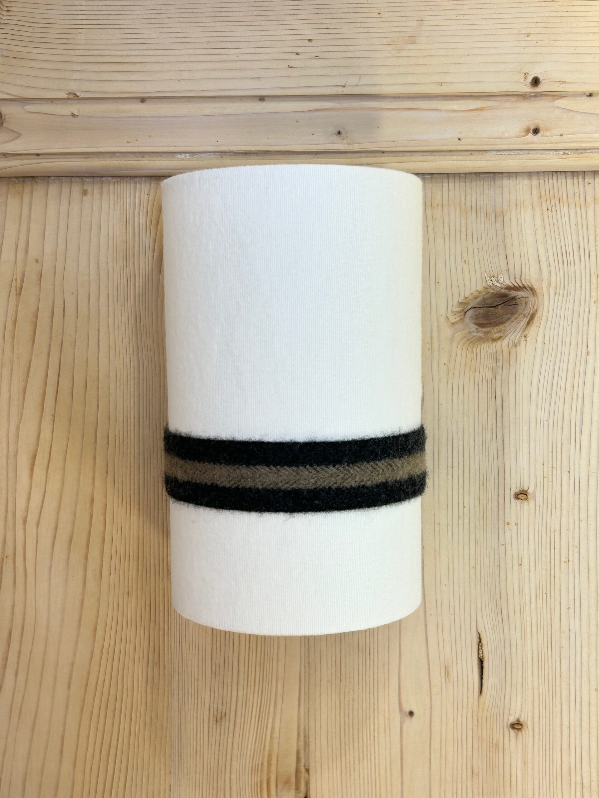 Elle est confectionnée en flanelle écru avec un beau ruban lainage de coloris au choix parmi notre sélection.