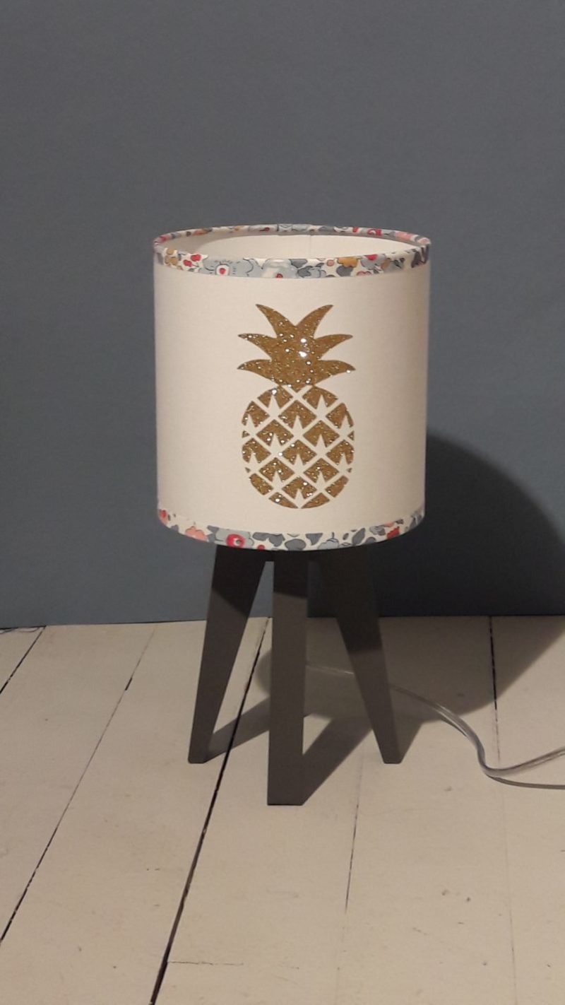 Au quotidien, il est important que votre enfant bénéficie d’une source de lumière homogène dans sa chambre. Cette petite lampe quadripode offrira à la fois un éclairage nécessaire pour sa lecture ou son travail mais aussi un éclairage doux. L’abat-jour est ici réalisé en popeline de coton blanche avec un appliqué ananas pailleté doré et d’une bordure Liberty betsy porcelaine.