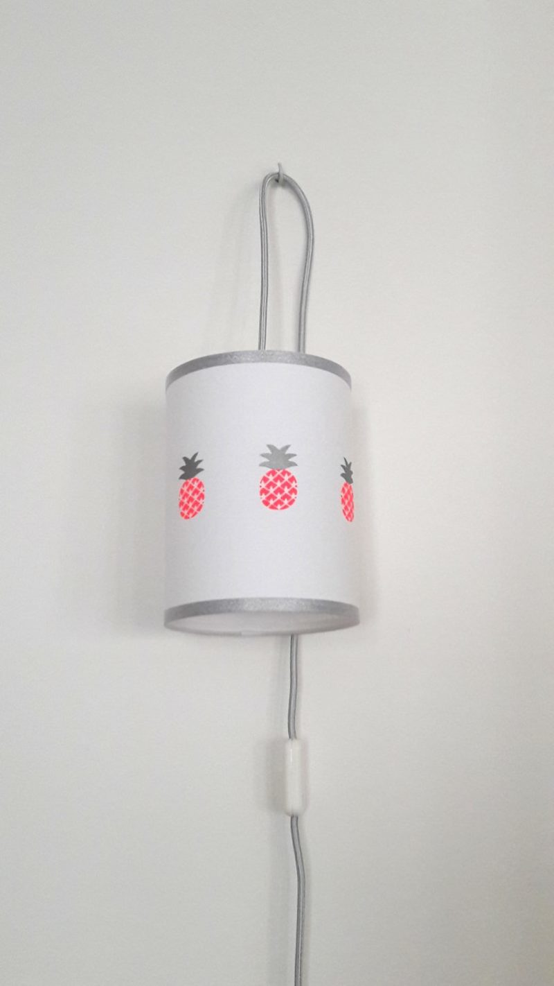 Il ne suffit que d’un simple clou pour la fixer, et cette lampe baladeuse illuminera parfaitement la chambre de votre enfant. Ainsi, pour ses soirées lectures, devoirs ou autres, votre enfant aura un éclairage suffisant pour subvenir à ses besoins. Ici, cette jolie lampe baladeuse en popeline de coton blanche avec ses trois petits ananas roses fluo et argentés sera très mignonne dans la chambre d’une petite fille.