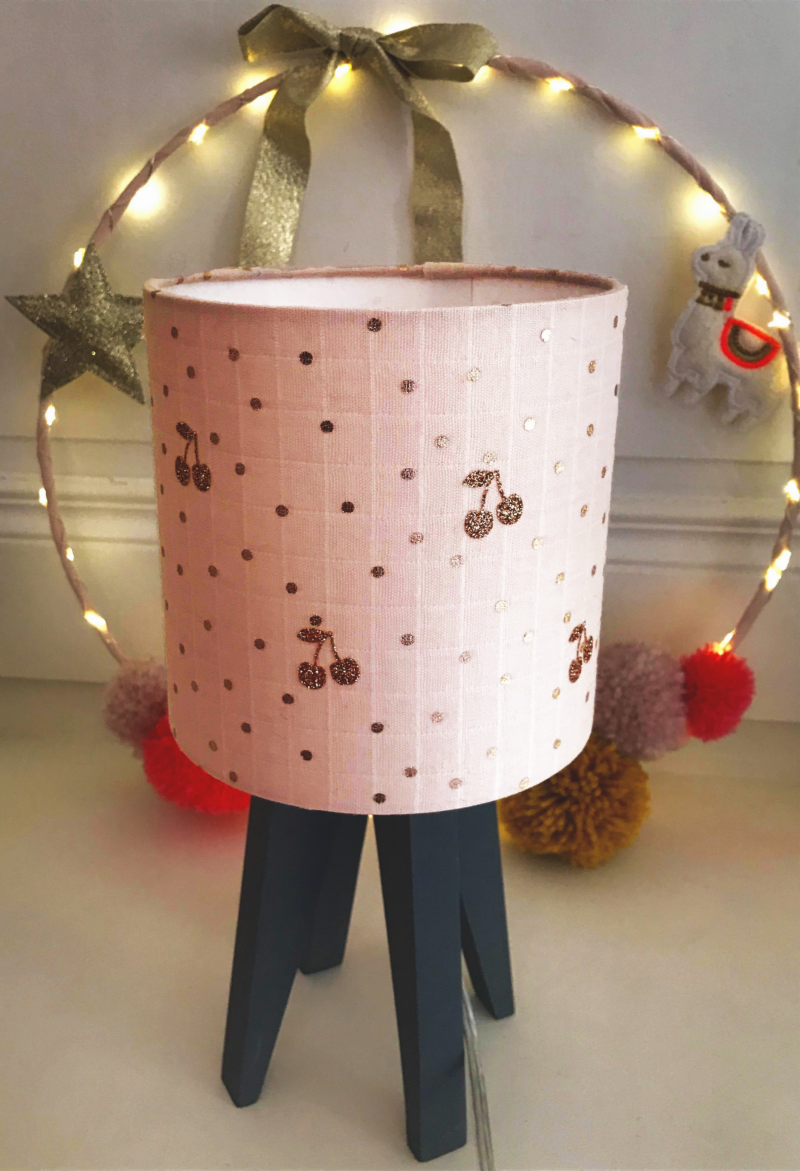 Cette jolie lampe quadripode est réalisée avec un abat-jour en gaze de coton rose nude et de pois cuivrées. Afin de la rendre plus jolie, un appliqué de mini cerises pailletées cuivrées a été apporté afin de la rendre plus personnalisée. Ainsi, cette petite lampe sera parfaite pour la chambre d’une jeune fille. Elle trouvera facilement sa place sur un bureau, une commode ou en guise de chevet. Enfin, son éclairage cocooning sera suffisant pour illuminer votre pièce.
