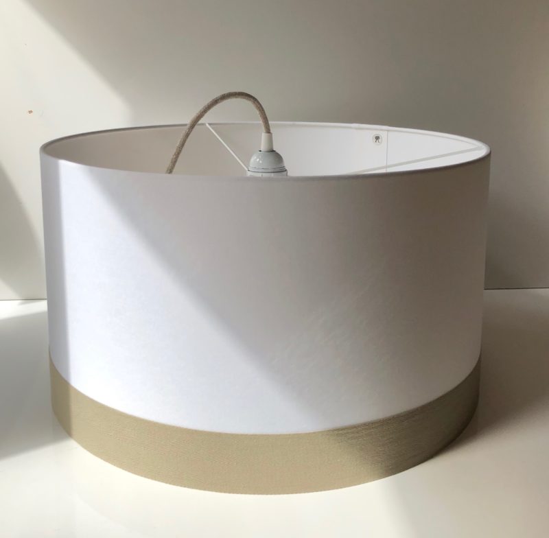 Pour ce modèle, nous l’avons voulu à la fois sobre et épuré pour qu’il s’harmonise parfaitement à votre intérieur. L’abat-jour de cette suspension a donc été réalisé dans une popeline de coton blanche de très belle qualité. De plus, nous avons souhaité lui apporter une bande assez large dans les tons de beige sable positionnée en bas de l’abat-jour. Ce luminaire sera parfait pour éclairer une grande pièce à vivre que ce soit suspendu au plafond au dessus d’une table de salle à manger ou dans une entrée. Cet abat jour peut aussi être réalisé sans son câble et ainsi être posé sur un lampadaire.