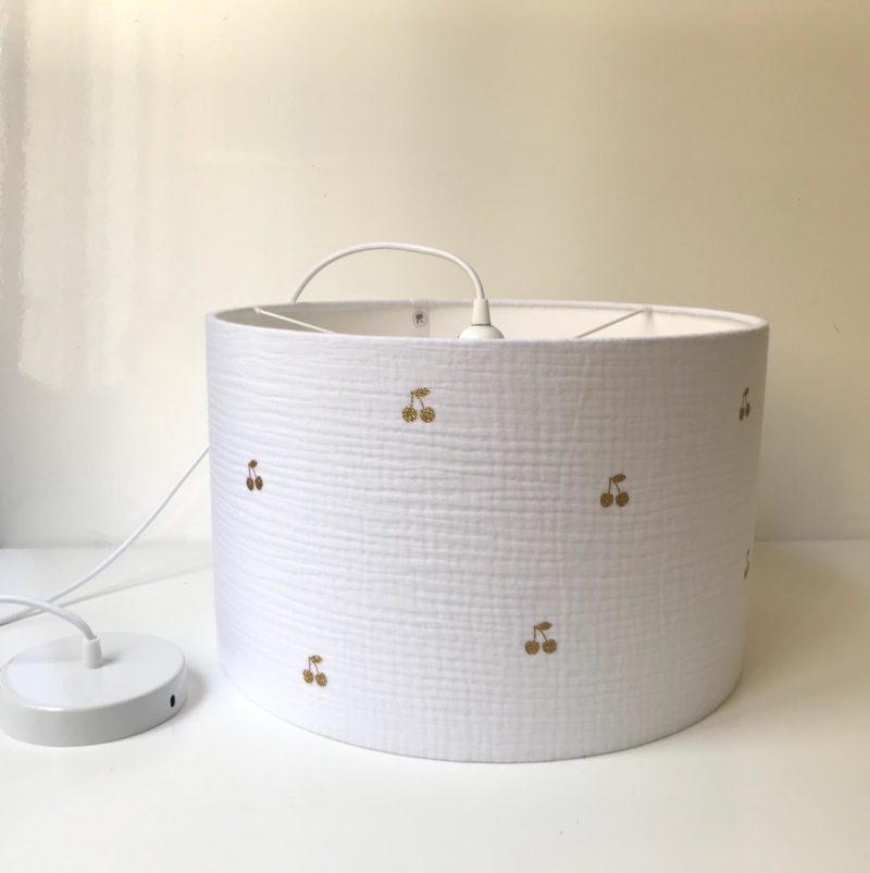 Afin d’éclairer la chambre de votre enfant et d’amener un peu de chaleur à votre décoration intérieur, cette suspension réalisée en double gaze de coton blanche avec ces cerises pailletées or est idéale ! De part sa matière toute douce, ce luminaire cocooning apportera une très jolie lumière. Il offrira un bel élément de décoration à votre pièce.