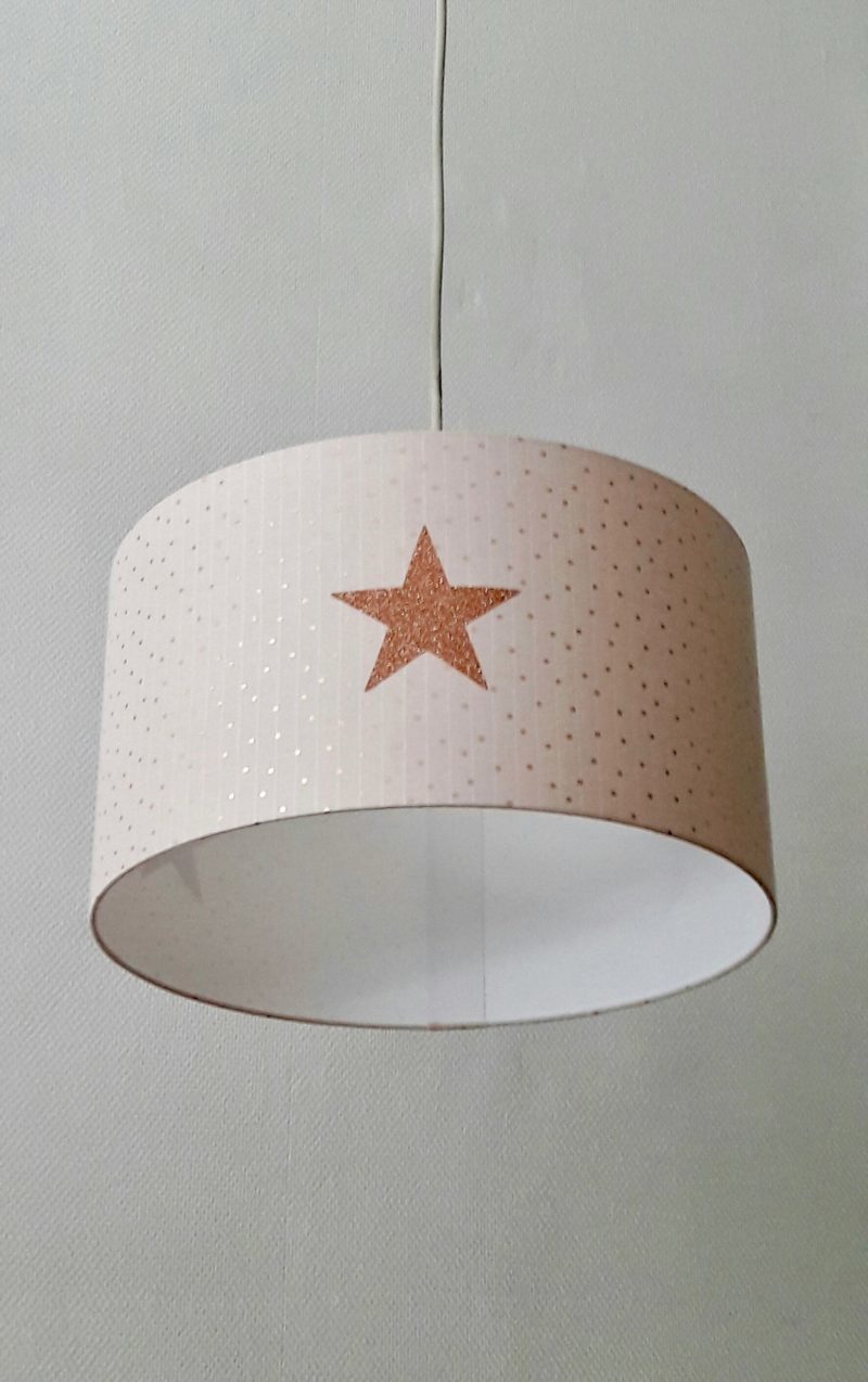 Il est indispensable d’éclairer nos pièces de vie afin de rendre notre quotidien agréable. C’est pour cela que cette suspension en tissu gaze de coton rose nude et de pois cuivrés sera parfaite pour illuminer la chambre d’une petite fille. Sur l’abat-jour est disposé un appliqué d’étoiles pailletées cuivrées répliqué trois fois en symétrie qui offrira une lumière très douce.